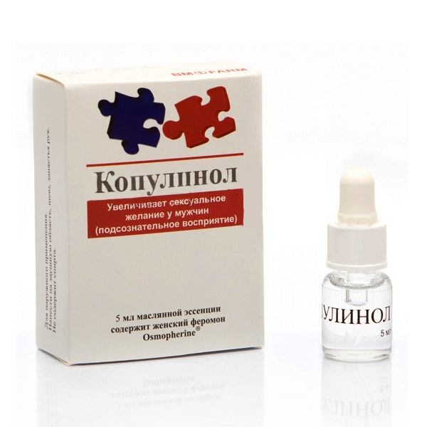 Феромонный концентрат без запаха для женщин «Копулинол» представляет собой высококонцентрированный вид осмоферинового синтетического феромона, свойства которого идентичны свойствам натурального феромонового копулина. Копулин – исключительно женский феромон. Эта группа феромонов повышает уровень тестостерона у мужчин до 150%. Это увеличение тестостерона вызывает возбуждение у мужчины в присутствии женщины.