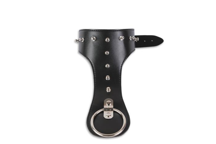 Воротник выполнен из высококачественной экологически чистой кожи, прочный и дышащий. Он имеет необычную фигуративную форму с удлиненной нижней частью, которая служит нагрудником. Воротник снабжен кольцом, к которому можно прикрепить любое устройство, например, поводок или неволи. По всей длине ворот украшен длинными металлическими заклепками. Мягкая подкладка подшита изнутри для комфортного и безопасного использования. Воротник легко регулируется по размеру и надежно фиксируется пряжкой.