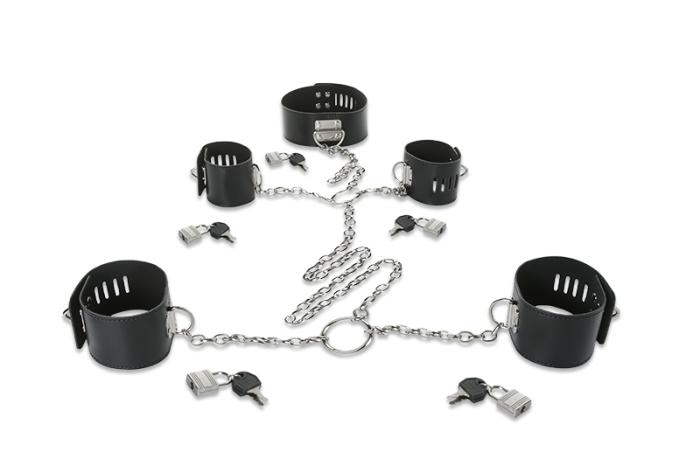 Новое от Spicy Things! Для самых смелых любителей жесткого сексуального развлечения предлагается набор стабилизаторов, состоящий из воротника, наручников и леггинсов, соединенных цепями и прикрепленных к навесным замкам.