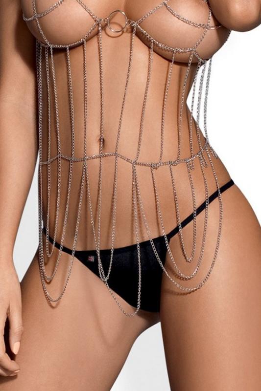 Игривая и мятежная страсть, смелая сексуальность и эротическая откровенность пронизывают каждую линию цепочки. Оригинальная верхняя часть состоит из серии цепочек, которые соединяются с круглым кольцом на груди. Верхняя часть возбуждает и завязывает на спине, она обладает соблазнительной энергией.
